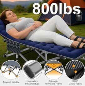 • Premium 1200D Fabric: Double-layer Oxford resists wear and supports stable sleeping; wipe clean with a damp cloth. The crossbar sits lower than the fabric to help reduce pressure points so you won’t feel the bar at night.